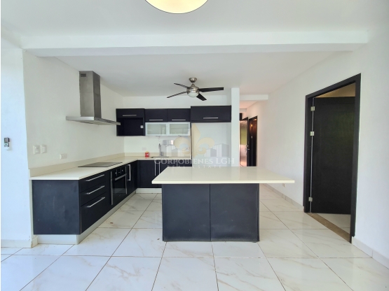 * Cocina integrada con isla cetral con desayunador y sobres en granito blanco.